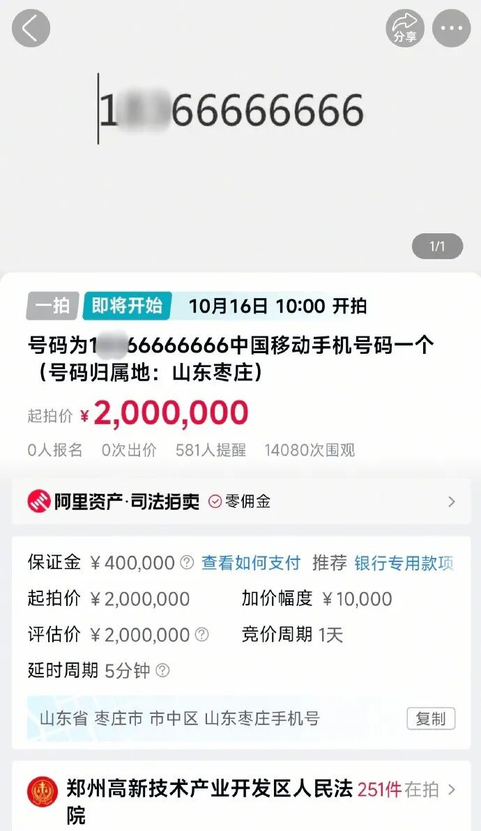 9月30日,大皖新闻记者从阿里资产平台看到,郑州高新技术产业开发区人民法院将于10月16日拍卖号码为“1**66666666”的移动手机号一个,起拍价200万元,此次拍卖还有一段时间,但已经吸引了14000多人次围观,只是暂无人报名参与竞拍。标的物介绍显示,“1**66666666”手机号归属地山东枣庄,运营商是中国移动,拍品所有人系被执行人张某。目前套餐159元,截至9月15日,话费余额负11.74元。法院提醒,对于该电话号码过户后的套餐及最低消费等,按照运营商相关政策办理。该号码起拍价为200万元,保证金40万元,增价幅度1万元。9月30日,大皖新闻记者致电该拍品咨询电话,工作人员李先生表示,这次拍卖涉及一起债权人撤销权纠纷,起拍价200万系申请执行人与被执行人双方的议价。“已经有几个人联系咨询,具体到时候看开拍的情况。”